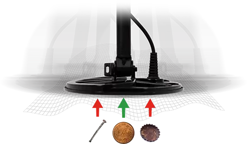 • Дискримінація допомагає відфільтровувати металеве сміття (наприклад, цвяхи чи кришки від пляшок), щоб ви витрачали більше часу на викопування цінних знахідок.